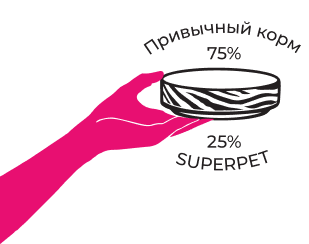 Утром, после пищевой паузы, положите в миску комбинированную порцию из 75% привычного питомцу корма и 25% SUPERPET.
