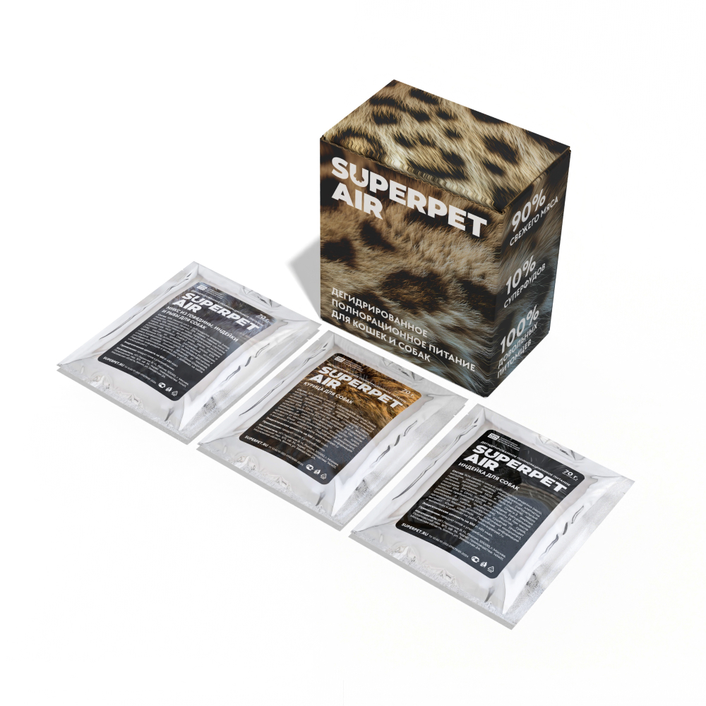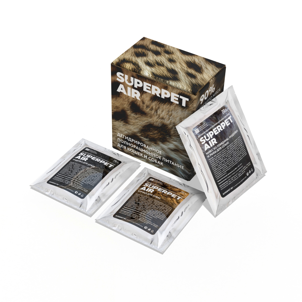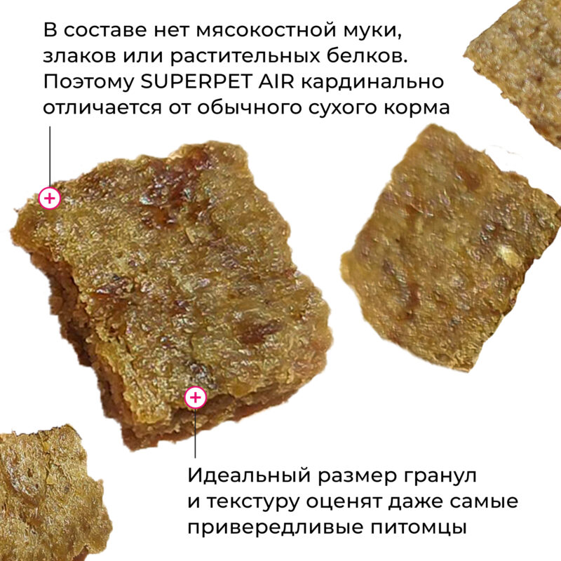 SUPERPET AIR — настоящая революция в кормлении кошек и собак. Это не сухой корм в привычном понимании, а новое поколение питания из 90% свежего мяса, субпродуктов и суперфудов. Никаких зерновых или бобовых, никакого глютена!